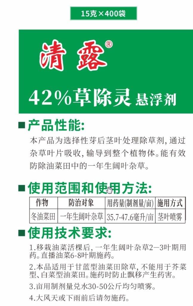 [使用技術(shù)要求]1.移栽油菜活棵后,一年生闊葉雜草2-3葉期用藥。直播油菜6-8葉期施藥。2.本品適用于甘藍型油菜田除草,不能用于芥菜型、白菜型油菜田。施藥時防止飄移產(chǎn)生藥害。3.畝用制劑量兌水30—50公斤均勻噴霧。4.大風天或下雨前后請勿施藥。5.油菜每個生產(chǎn)周期最多使用1次。